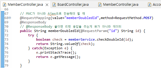 @ResponseBody를 사용하여 view를 내려주는 대신 data를 해당 jsp에 내려보내주게 된다.