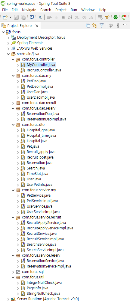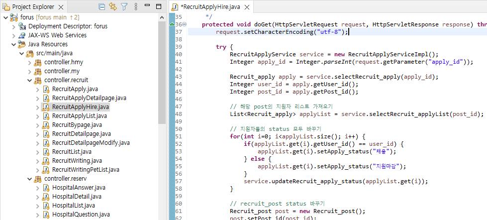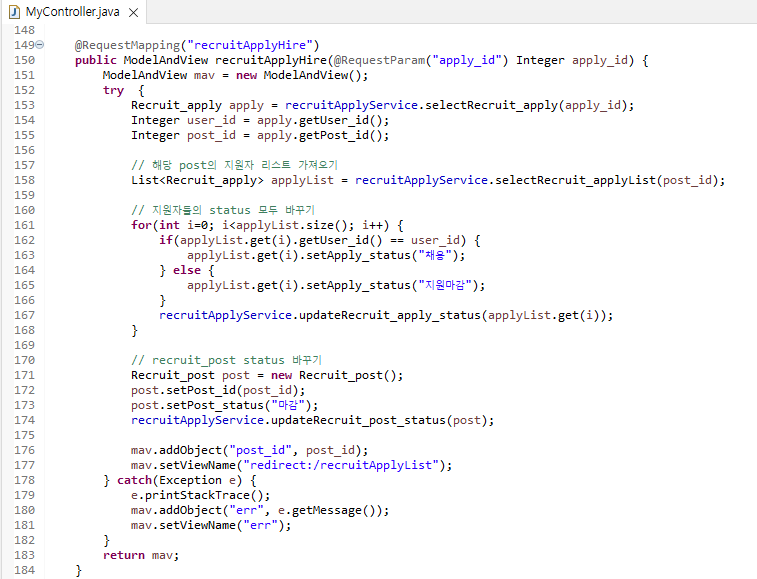기존의 recruitApplyHire.java servlet 파일이 MyController의 함수로 변경