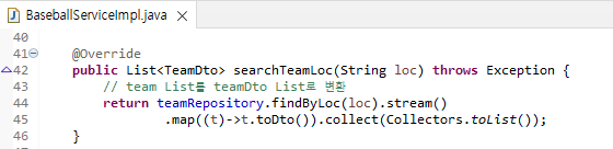 loc을 기준으로 team을 찾고, stream으로 변환한 후 team의 toDto()메서드 실행, teamDto로 바꿔준다.