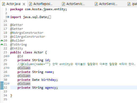 @Column(name="") 만약 entity의 컬럼명과 테이블의 컬럼명이 다르면 name으로 테이블의 컬럼명을 써줘야 한다.
