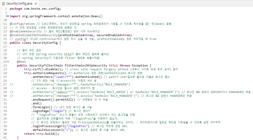 로그인 필수, 권한 설정, 내가 만든 로그인 폼을 사용할건지, 로그인 url 설정 등의 기능을 가진다.