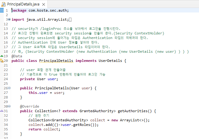 UserDetail을 상속받는 PrincipalDetail 클래스를 만들어 User를 포함시킨다.