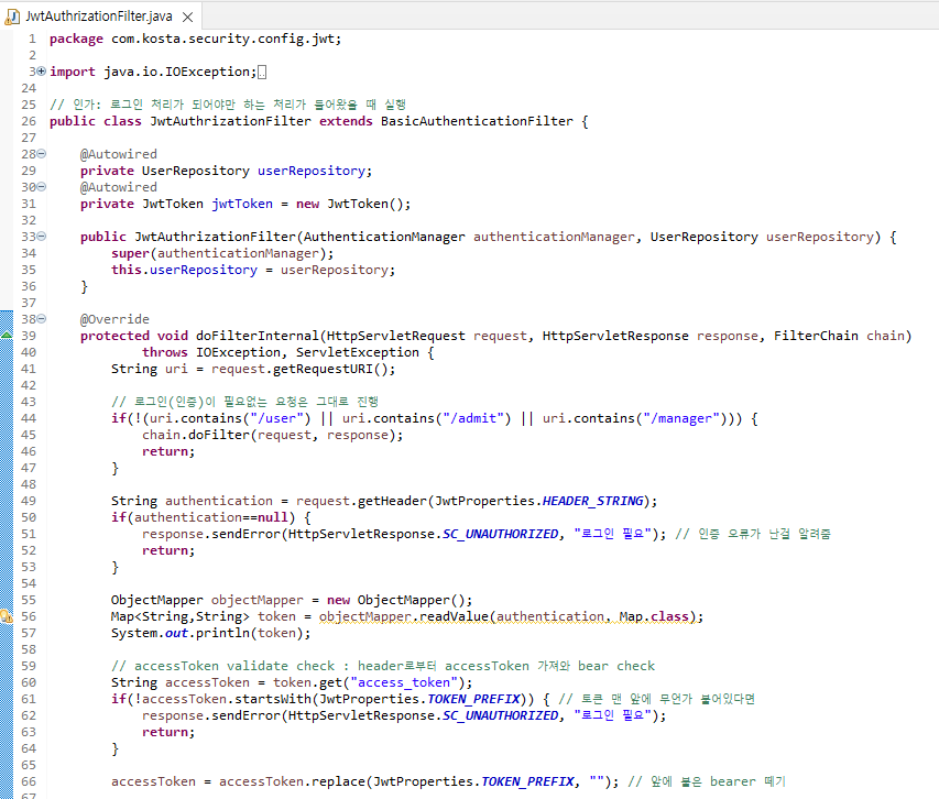 spring security architecture와 구조는 동일하나 앞의 AuthenticationFilter와 token을 spring security가 자동으로 해주는 것을 막고 내가 생성한 필터와 토큰으로 중간에 가로채서 사용한다.