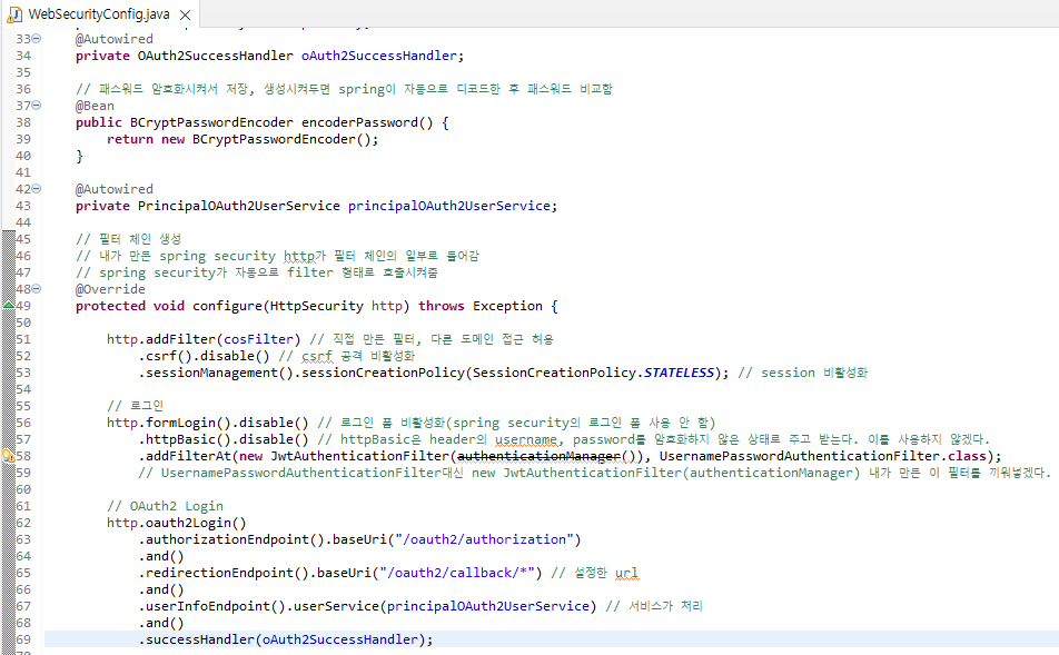 소셜 로그인 과정에서 위에서 생성한 OAuth2SuccessHandler를 붙여준다.