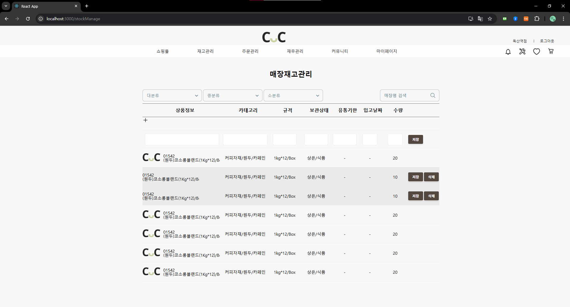기존 행을 누르면 해당 재고가 나온다.(유통기한이 다른 같은 상품 확인 가능)