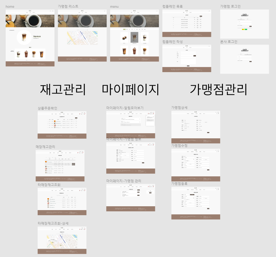 만든 페이지 수 17페이지 + 헤더 3가지(메인, 가맹점, 본사)