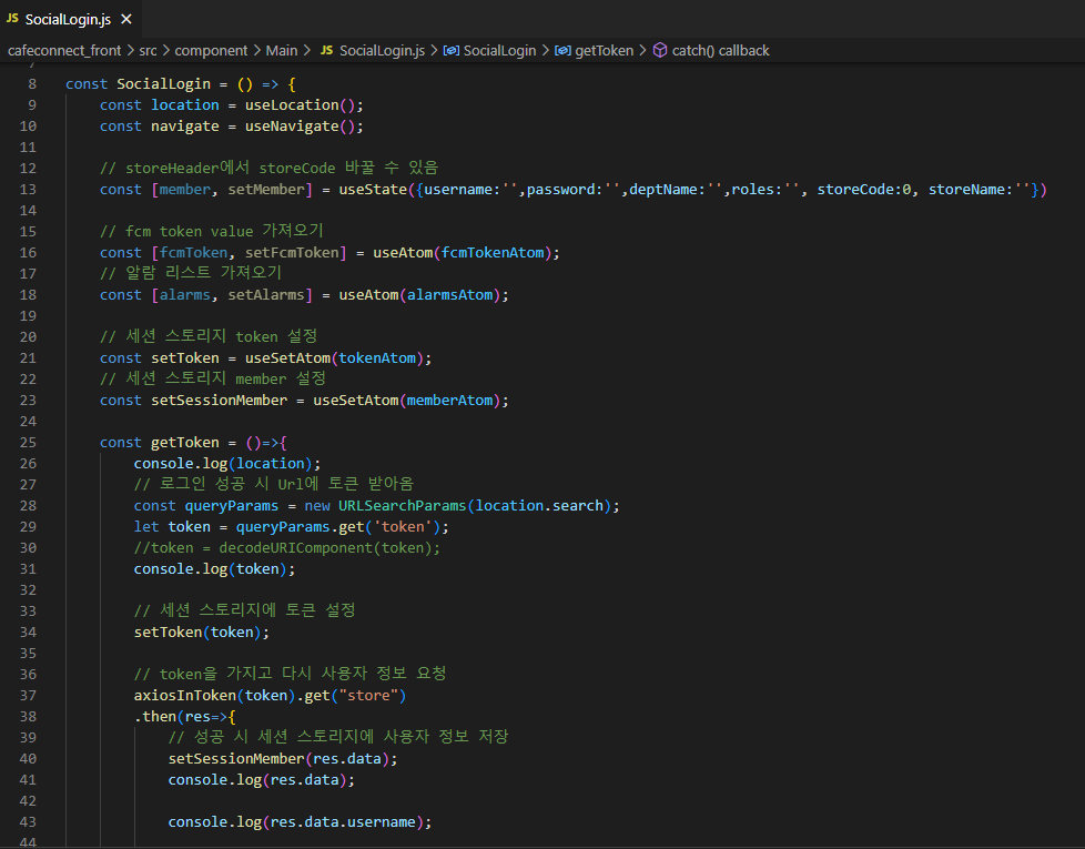SocialLogin.js 에서 fcmToken까지 가져오려 했으나 소셜 로그인을 하면 새로고침이 되어 새로 fcmToken을 가져오는데, 이 가져오는 시간보다 fcmToken을 가지고 요청하는 axios가 더 빨라 제대로 설정되지 않는 문제가 발생한다.