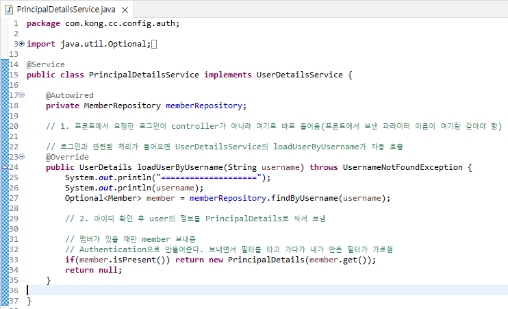 PrincipalDetailsService에서 Member 엔티티를 MeberRepository로 가져오는데, Member로 가져오면 영속성 컨텍스트 내에 존재하지 않아서 제대로 가져오지 못 해 발생하는 에러 같음
