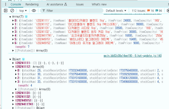 아이템코드를 기준으로 stock들을 묶어주고 프론트로 전송한다.