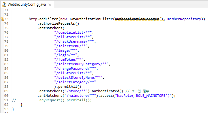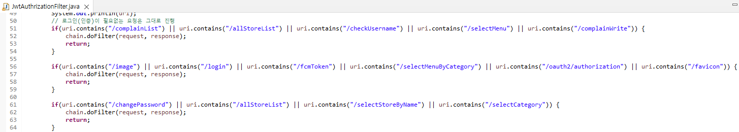 따라서 인증 직전에 인증이 필요하지 않은(로그인 하지 않아도 처리 가능해야할) uri들을 모두 걸러서 return 해주었다.