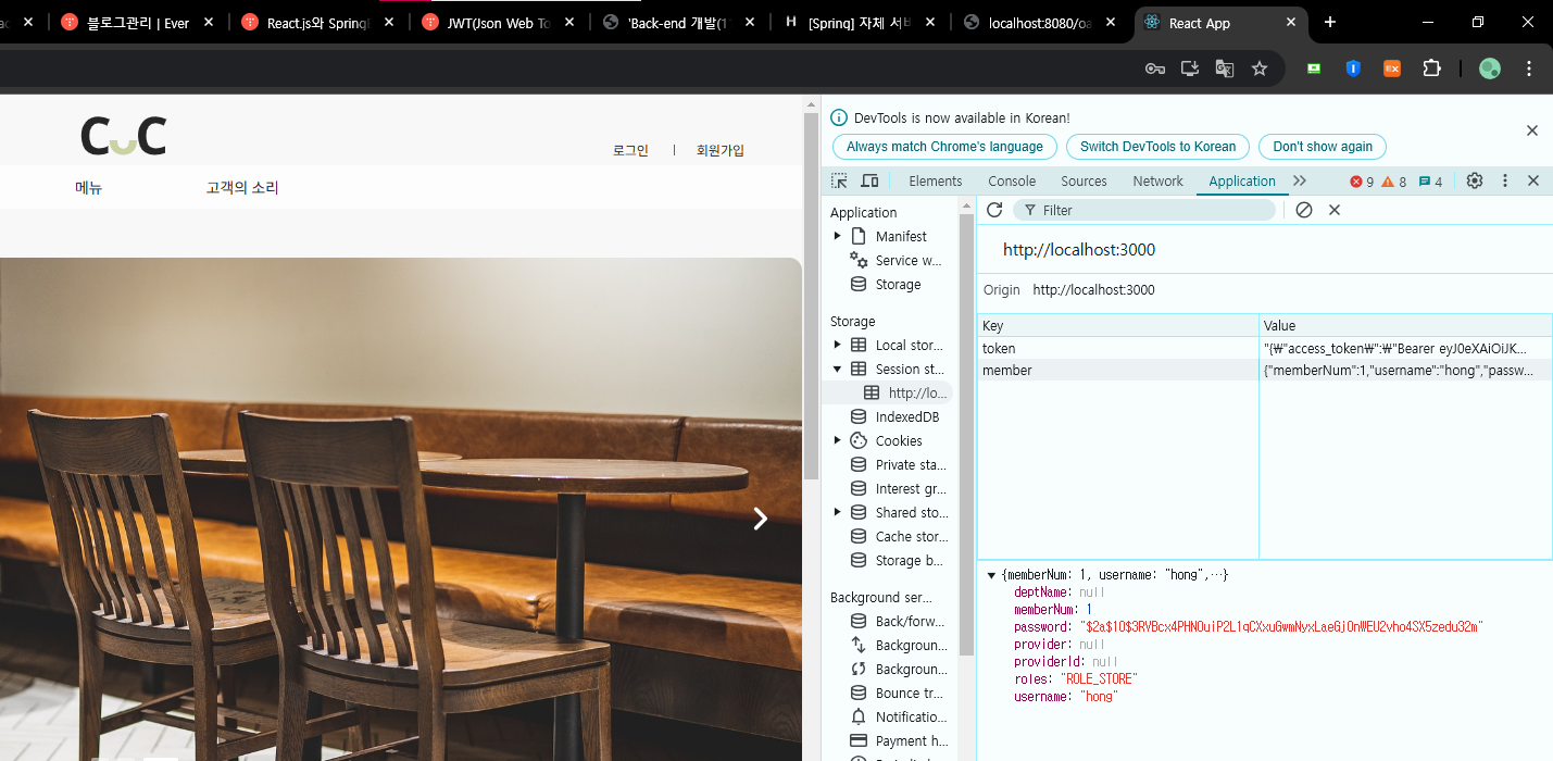 가맹점 로그인 후 가맹점 페이지로 잘 넘어가고, 토큰과 멤버 정보가 세션스토리지에 저장되어 있다.