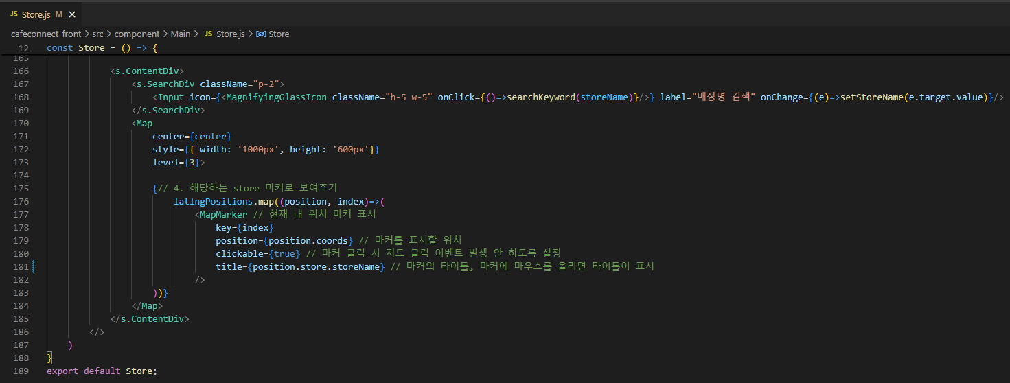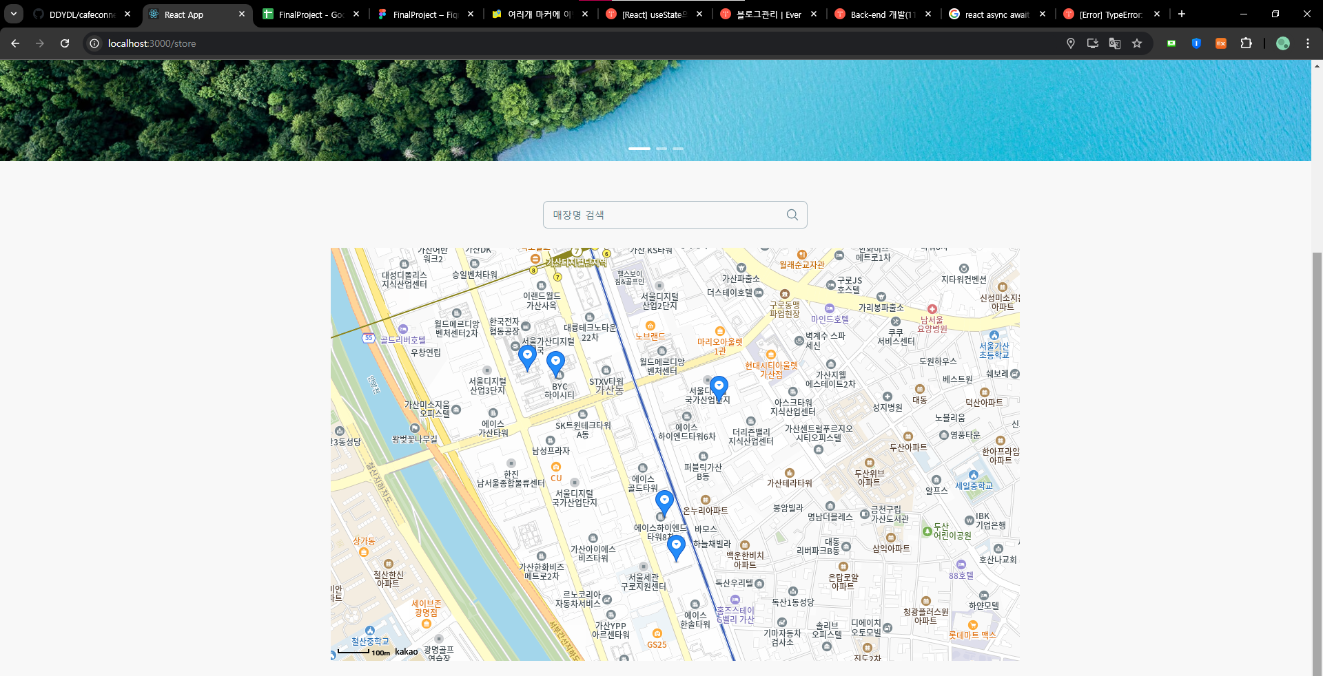 -> 순서 문제라고 생각되어 async/await를 주어 가맹점 먼저 가져오기 -> 위도/경도 변환 -> useState 변수에 세팅