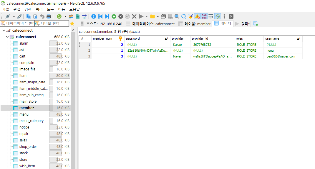 데이터베이스에도 kakao와 naver로 로그인한 계정이 잘 들어감