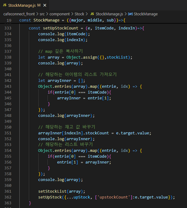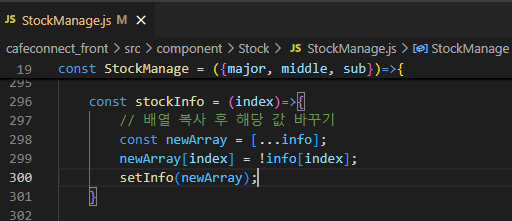 -> 해당하는 인덱스와 변경한 값을 받아 해당 인덱스에 들어가 있는 리스트의 값을 수정하고, 해당 리스트 전체를 바꿔 리랜더링이 일어나도록 설계하였다.