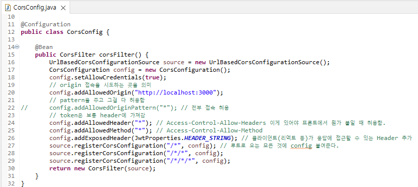 CorsConfig에서 테스트를 위해 모든 접속을 허용해 놓은걸 3000(react 포트) 포트만 허용으로 바꾼다.