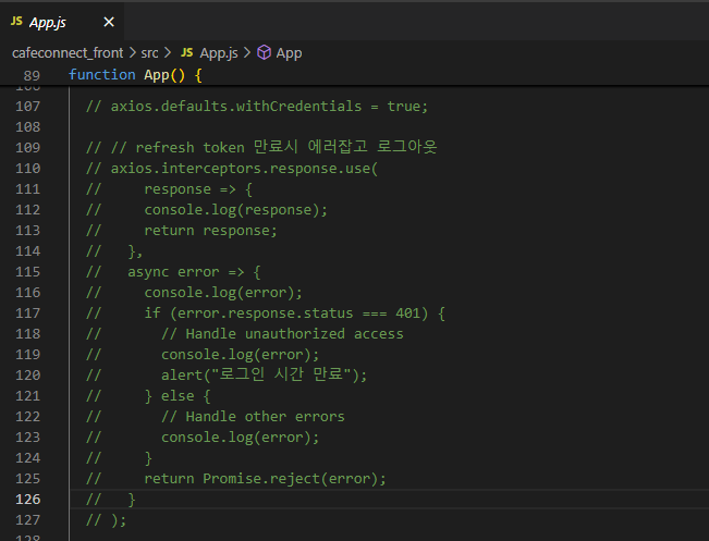 원래 전역으로 에러를 가로채서 한 곳에서 처리하려고 했으나 axios는 가로채오는데, 직접 만든 헤더가 달린 axiosInToken은 에러를 가로채오지 못 했다.