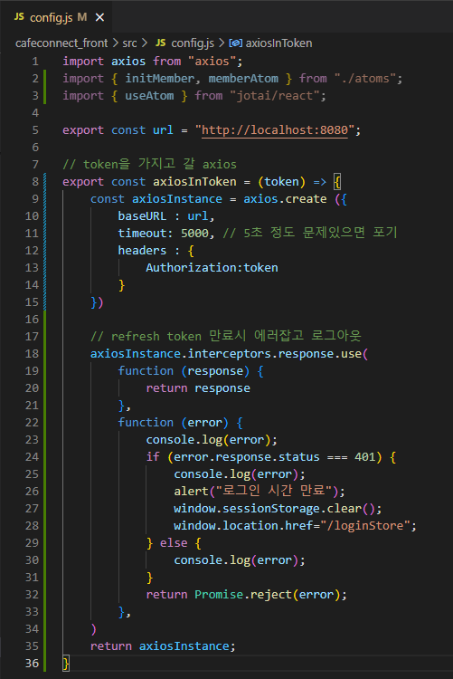 axiosInToken안에 interceptors를 넣어 세션을 지우고 로그인 창으로 넘어가도록 함.