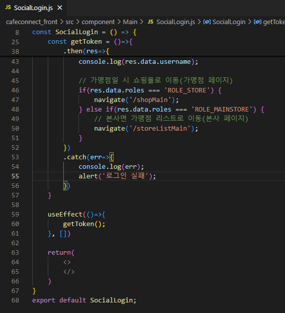 소셜로그인은 가맹점만 가능하므로 따로 roles 확인이 필요하지 않으나 만일을 위해 넣어놓았다.