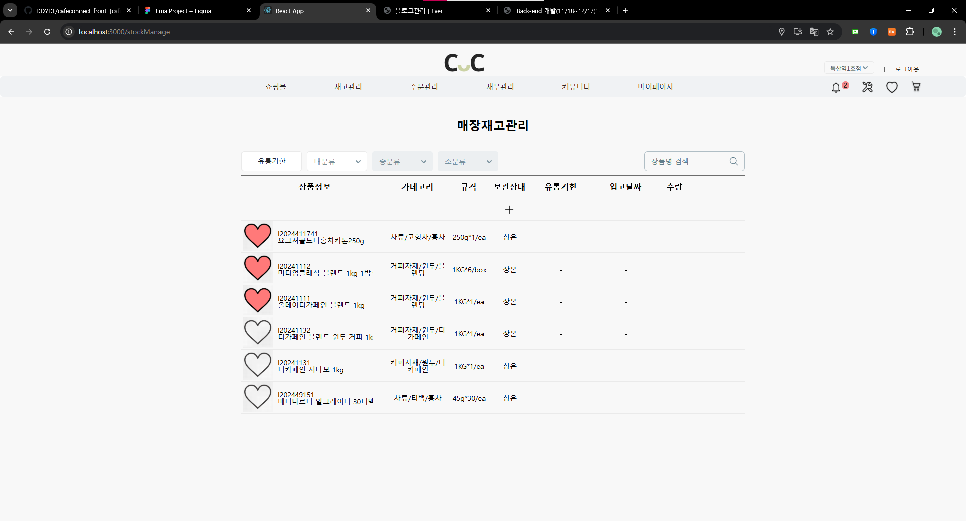 로그인 -> 재고관리 -> 마이페이지-> 메인페이지 -> 알림모달