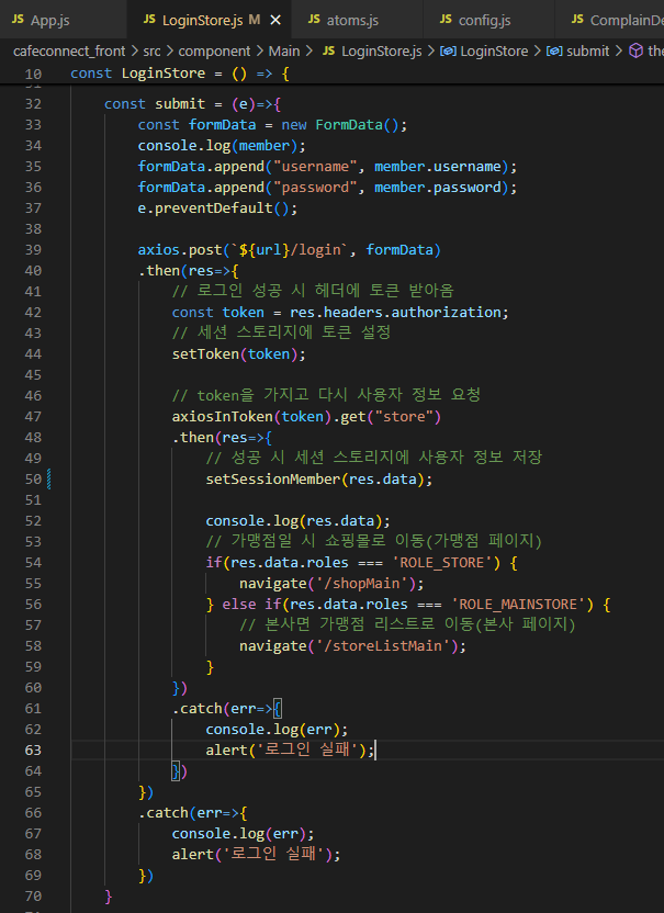 일반 로그인은 LoginStore.js 에서 바로 사용자 정보를 받아오지만 소셜로그인은 인증 후 다음 url(ShopMain.js)로 이동한 후 url에 token 정보를 받아오므로 컴포넌트가 변경된다.