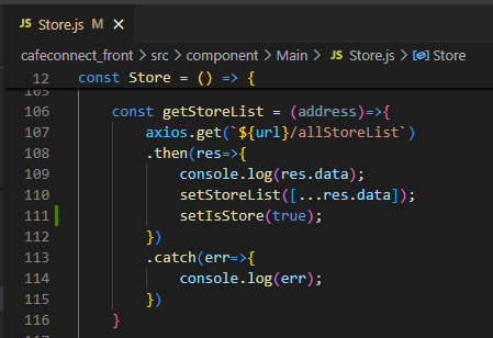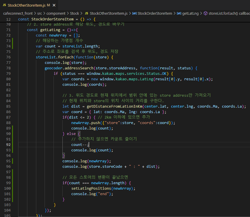 가맹점 리스트를 세팅하고 isStore를 true로 만들면 getLatLng() 함수가 실행된다.