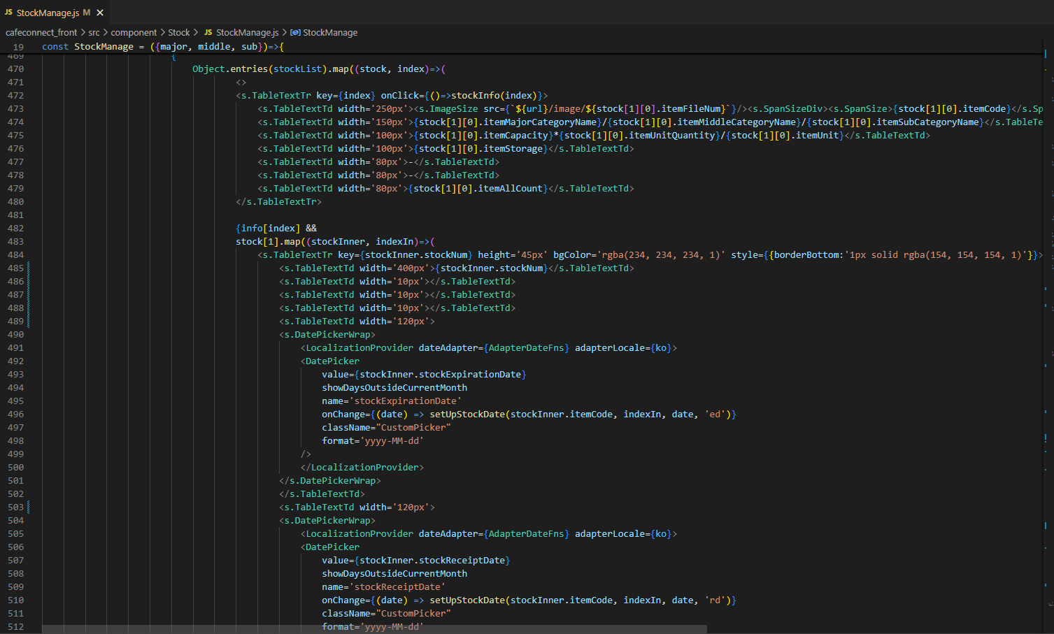 -> Map을 map()함수로 돌리면서 행을 보여주는데, map안에서 setState함수를 사용할 수 없으므로 선택한 행만 upStock에 넣을 방법이 없었다.