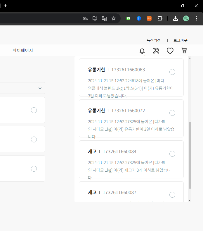 체크 박스 클릭하면 알람은 사라지고, 데이터베이스에 alarmStatus가 true로 바뀌어 리스트에 보이지 않게 된다.