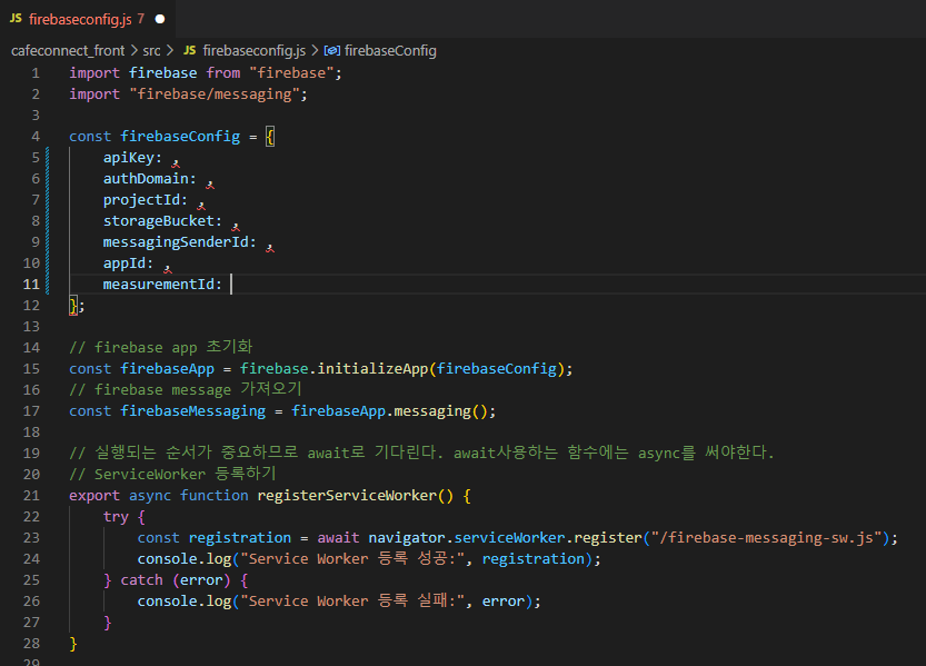 firebase 앱을 생성하고 얻은 설정을 입력한다.