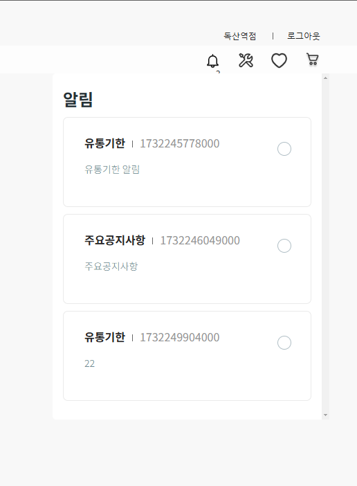 알람 아이콘 클릭 시 모달이 열리며 알람 리스트가 보인다.