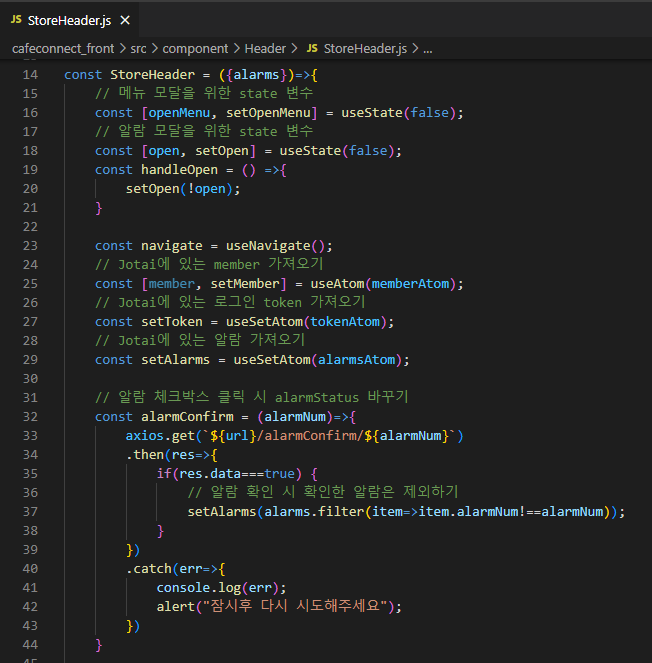 가맹점 헤더에 알람이 있으므로 Jotai의 알람 리스트를 얻어와서 설정해준다.