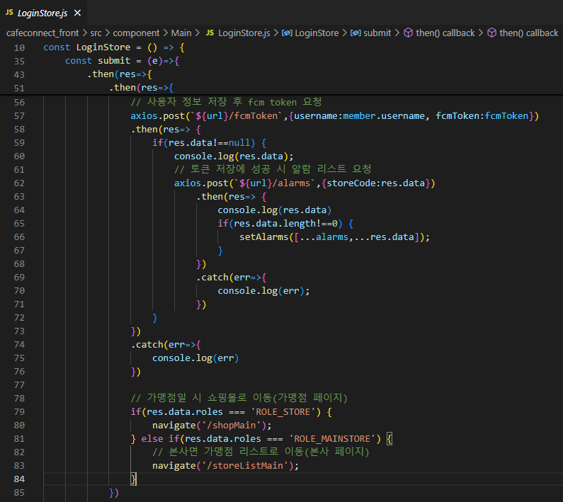 알람 리스트를 가져오려면 해당하는 storeCode가 필요하므로 로그인했을 때 member에 해당하는 Store를 모두 가져온 후 하나를 넣어준다.(member에 저장)