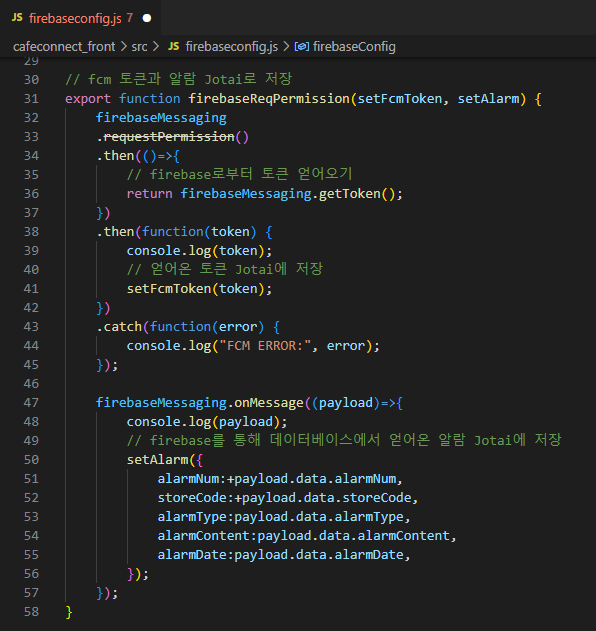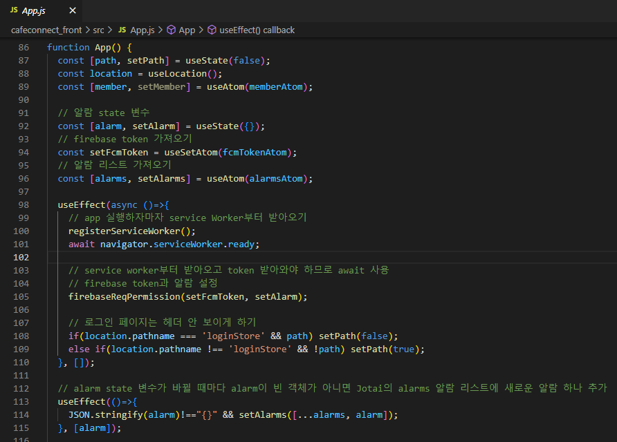 App.js에서 useEffect를 사용해서 앱이 실행되자마자 service worker가 등록되고, fcm token을 얻어오도록 한다.(Jotai에 fcmToken 저장)
