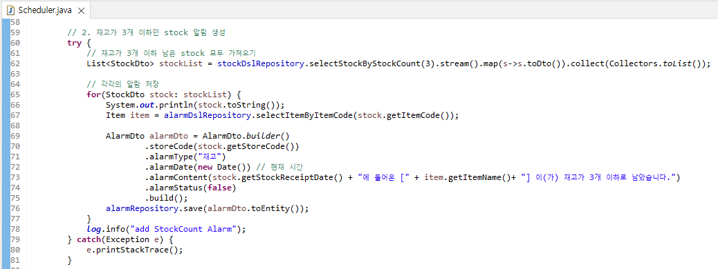 2. 재고가 3개 이하 남은 stock에 대한 알람 생성