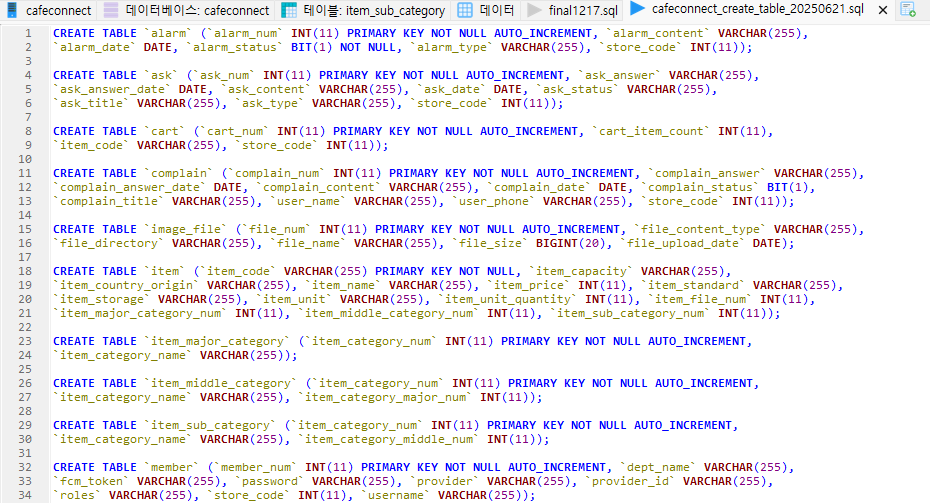 기존 파일에 데이터베이스 구조를 생성하고 외래키까지 잡는 sql문이 없어 다시 만듬