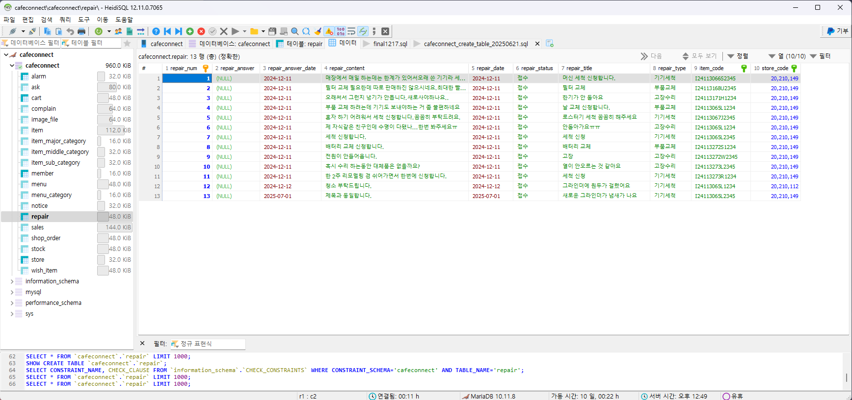 중요한 점은 테이블 생성 후 외래키 설정 전에 해주어야 제약조건에 걸리지 않고 수정된다.