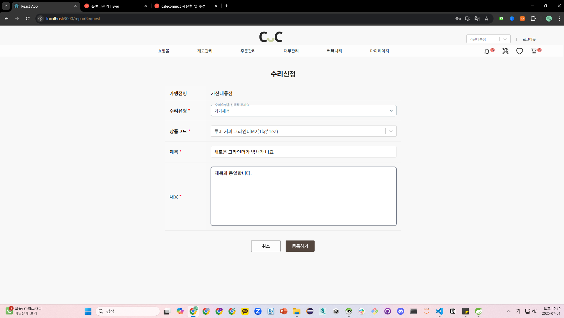 연결 후 데이터베이스, 백엔드, 프론트까지 실행 후 데이터를 넣어보았다.